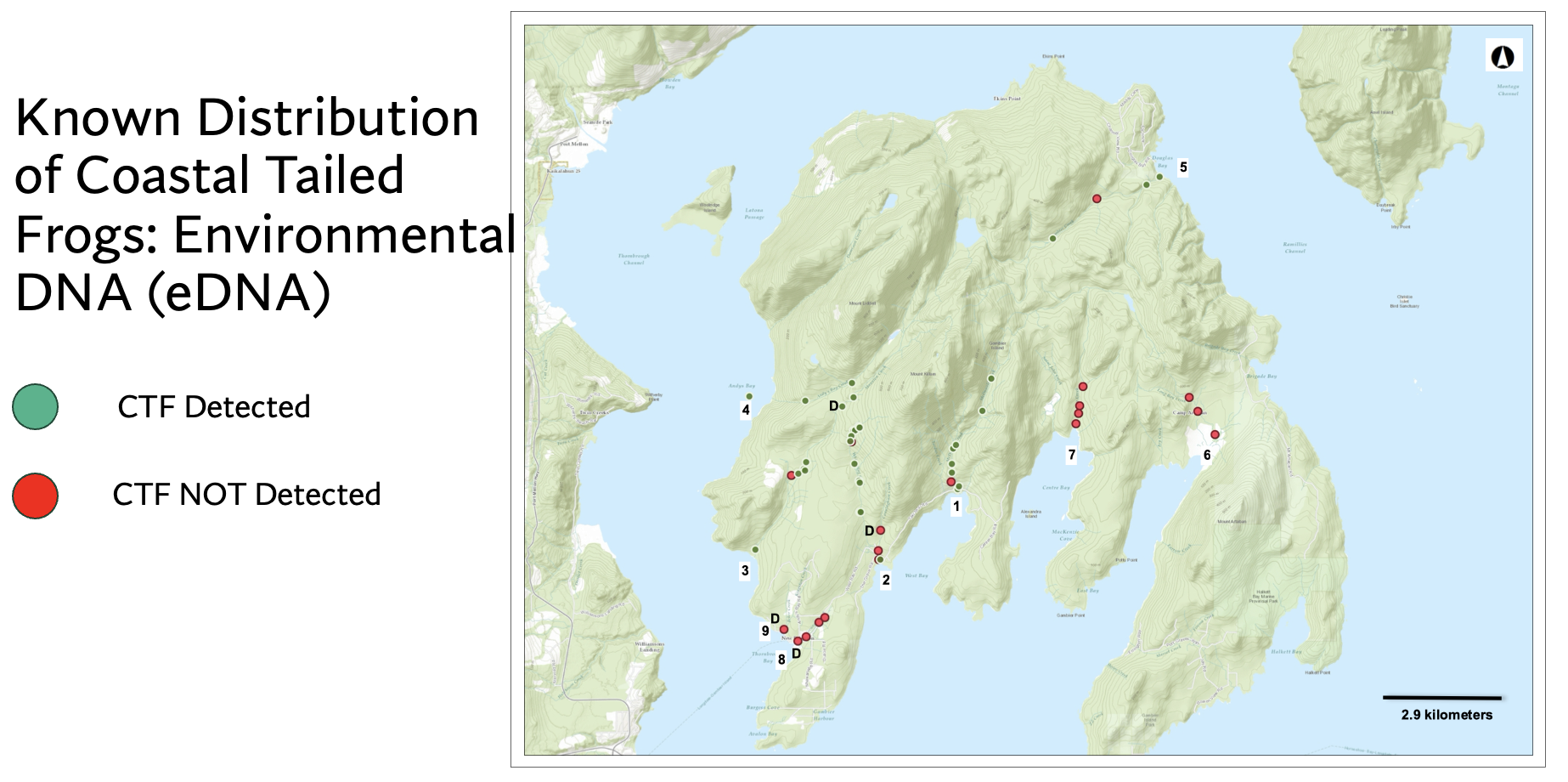 Identifying the distribution of species at-risk is a key step in ensuring amphibian species’ protection. Presence and distribution data indicate habitat that needs protecting, as well as direct monitoring efforts for populations. The Coastal Tailed Frog (Ascaphus trueii) is listed as Special Concern by the Federal Species At Risk Act (SARA) and there were no official government records of the species on Gambier Island, until now.